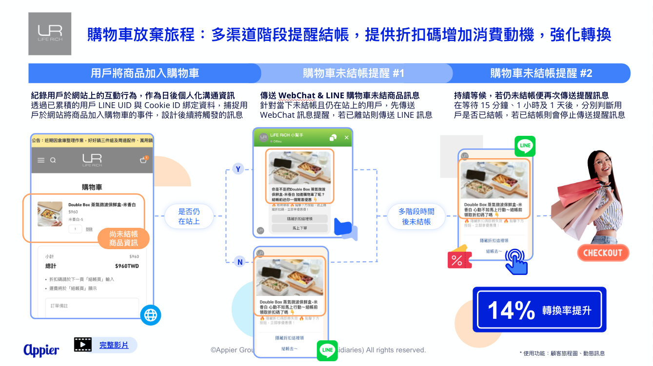 3.2 購物車放棄旅程:多渠道階段個人化通知結帳,強勢帶動 14% 轉換率成長