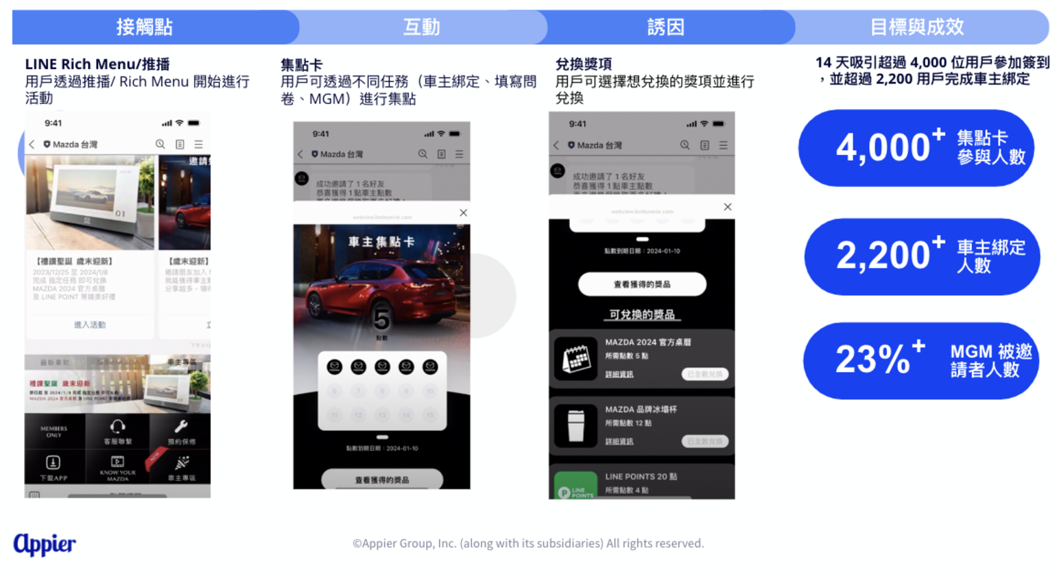 在為期 14 天的聖誕行銷活動中,用戶可使用累積的點數兌換 MAZDA 冰壩杯等多項獨家好禮,提供用戶持續參與活動的誘因。