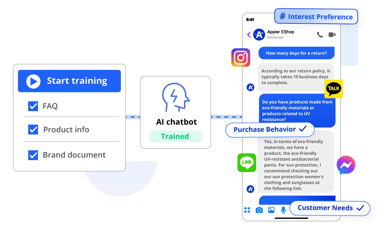 只要提供品牌完整資料,包含 FAQ 文案,產業與產品資訊文件等,上傳至後台即可完成訓練,幾分鐘就能測試上線。