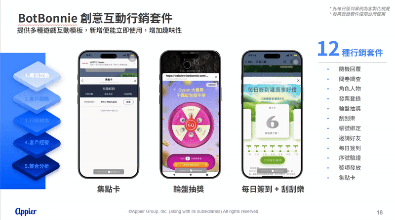 - 遊戲化行銷: 內建抽獎、問卷、MGM(會員推薦會員)等模組,提升互動趣味性,加速會員增長。