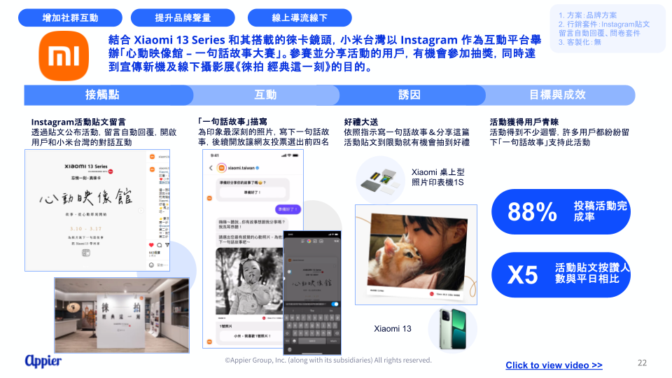 - 小米台灣以 Instagram 為主要互動平台,舉辦「心動映像館-一句話故事大賽」,鼓勵用戶參與並分享貼文,就有機會參加抽獎。此次活動成功提升社群互動與品牌聲量,同時達成線上導流至線下的目標,不僅投稿完成率高達 88%,活動貼文按讚數也成長 5 倍。