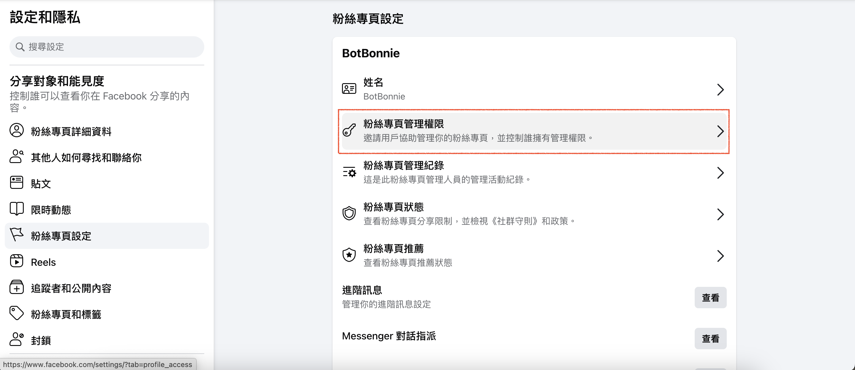 - 確認 Facebook 個人帳號的權限,您使用的 Facebook 個人帳號需具有該粉專的「完整控制權」。