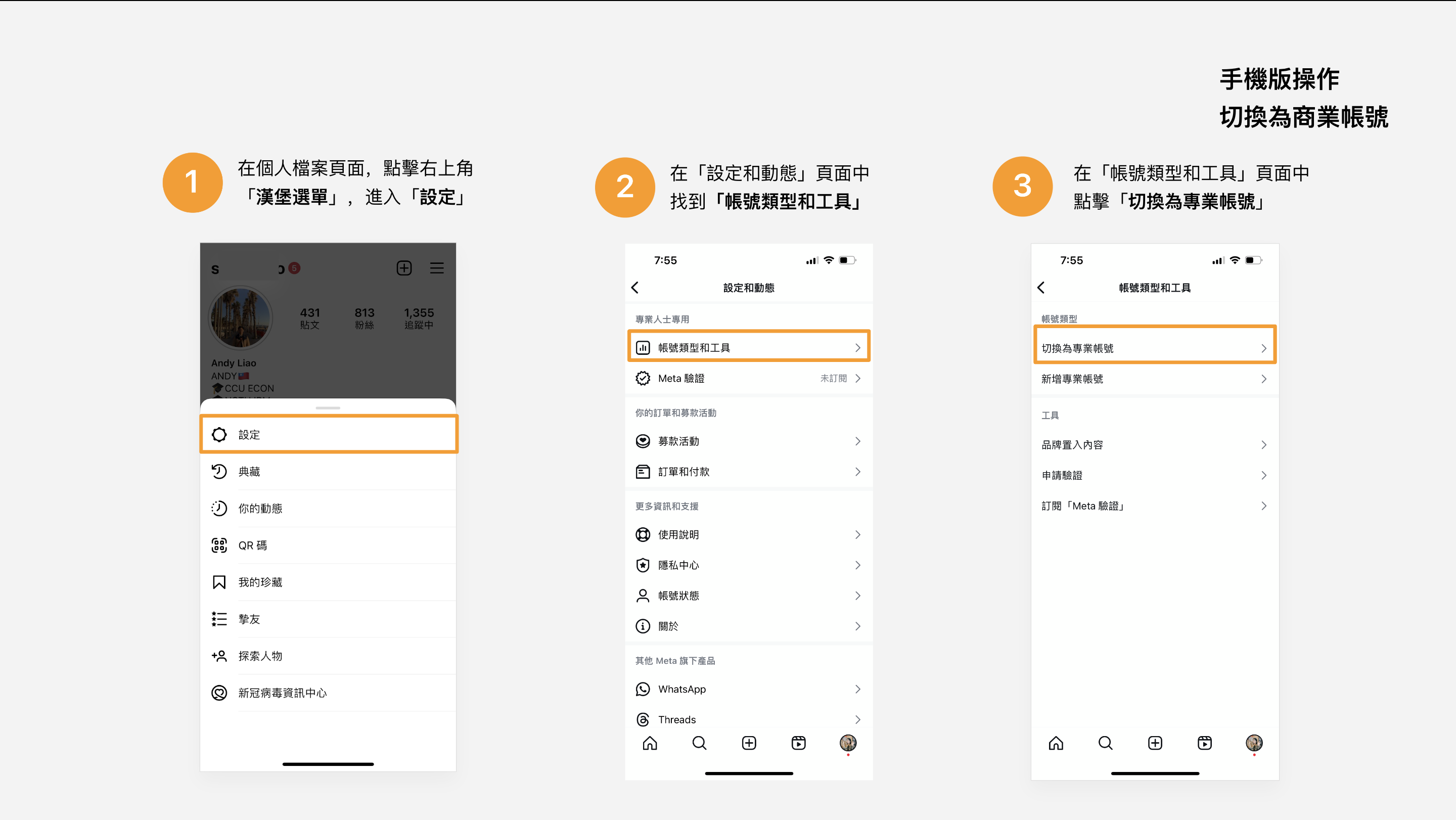首先,你的 Instagram 必須是商業帳號才能串接聊天機器人,如果是個人帳號,請參考下方教學!如果你的 Instagram 已經是商業帳號了,請直接跳到 串接 Facebook 粉專 步驟。