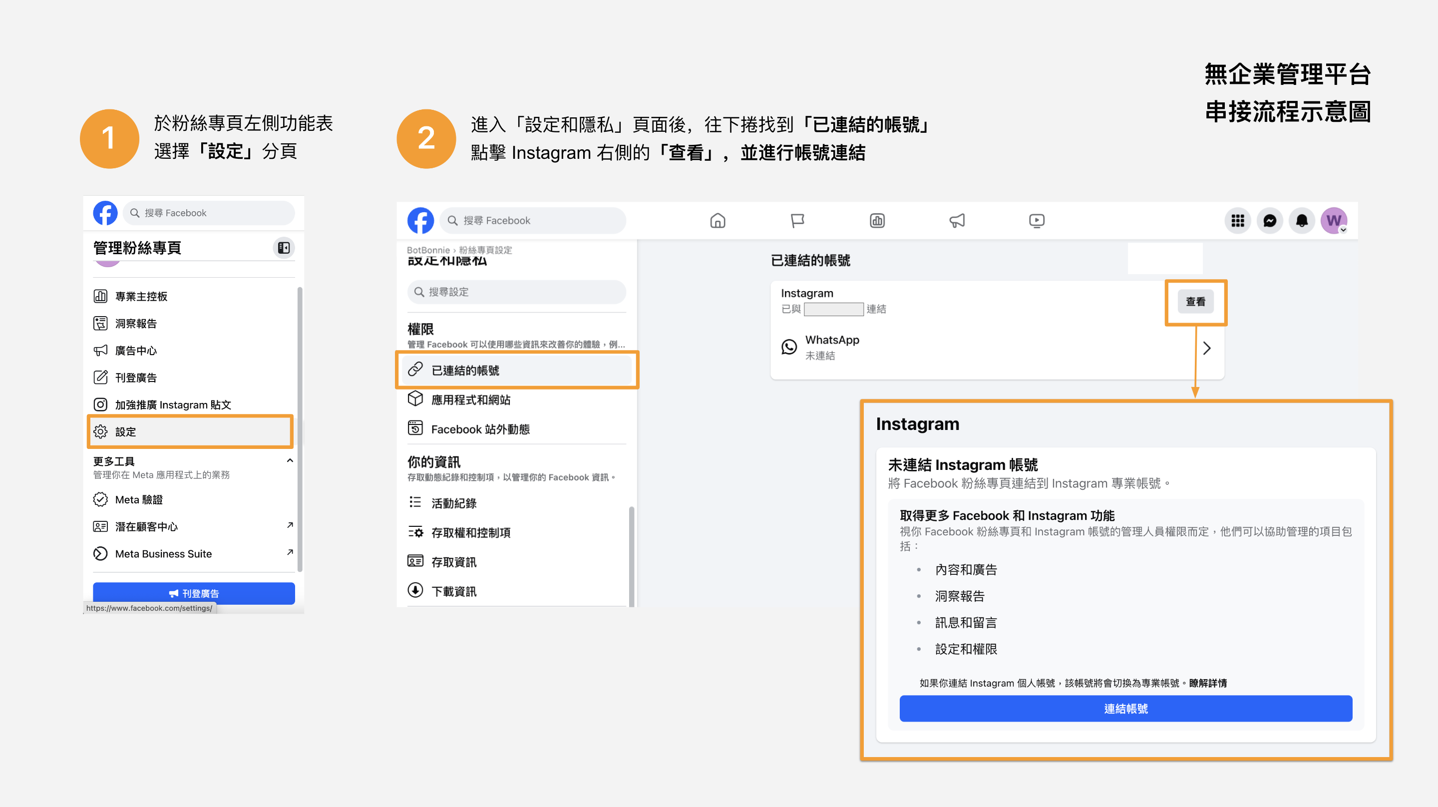 1. 將 Instagram 商業帳號與 Facebook 連結。